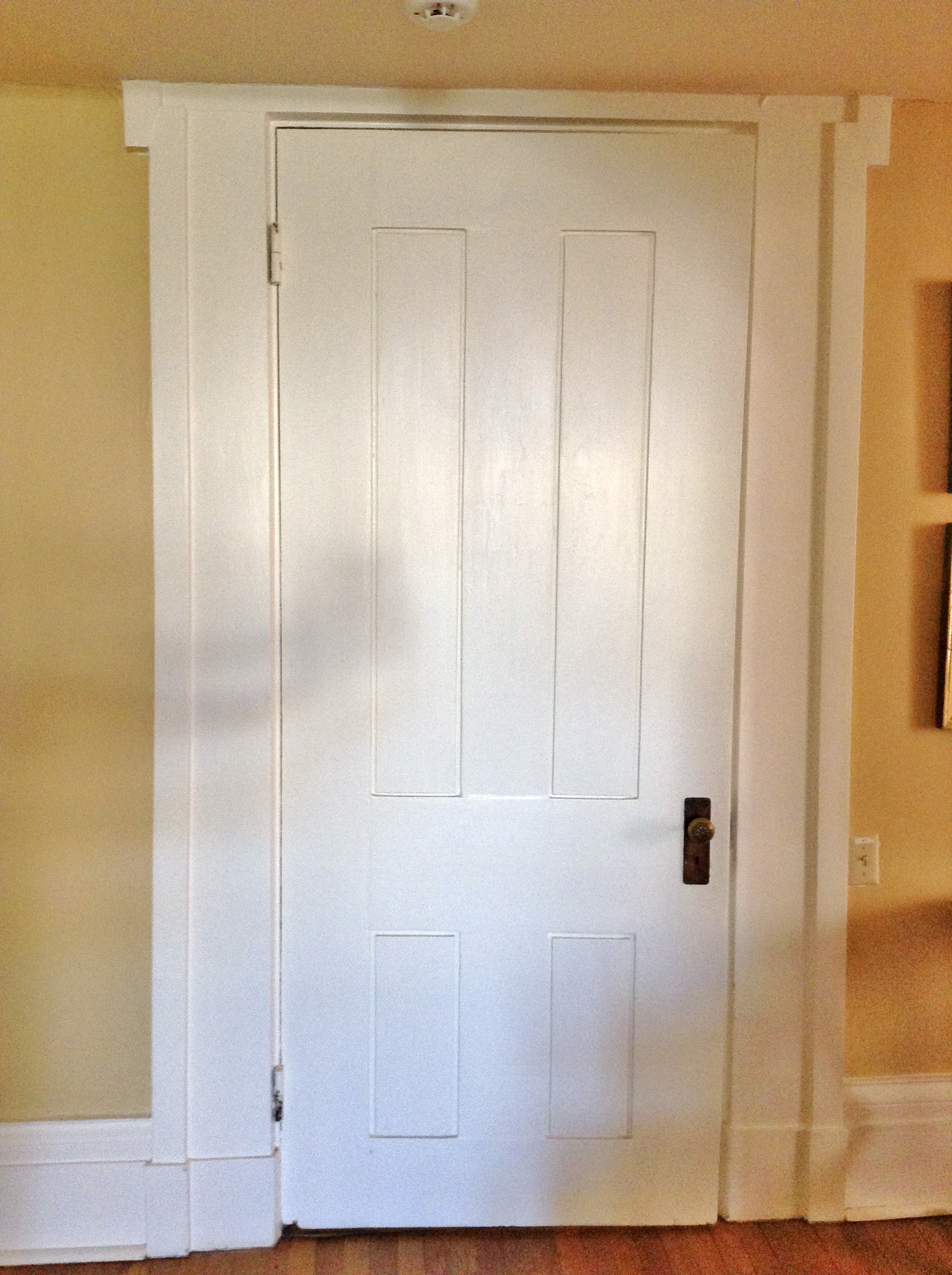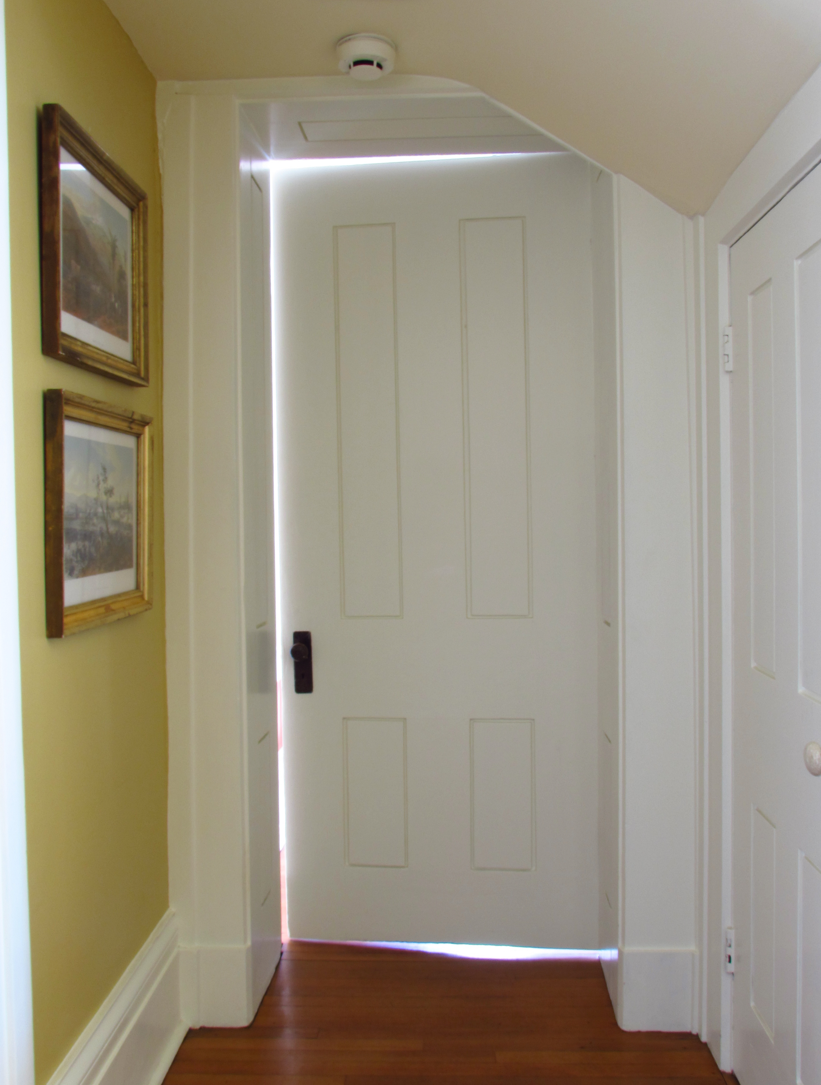 Look at the top of the doorway - can you see what's wrong? The staircase engages with the front of the doorway: the right corner of the threshold is lost and the millwork above and to the left of the door is heavily compromised. Was this just a carpentry mistake? No - this is the effect of unrealistic expectations. The Hill family, who commissioned this project from Master Builder Abner Cook, could not afford their grand project. The building as originally designed would have been deeper, and the door never would have been cut by the stairwell.