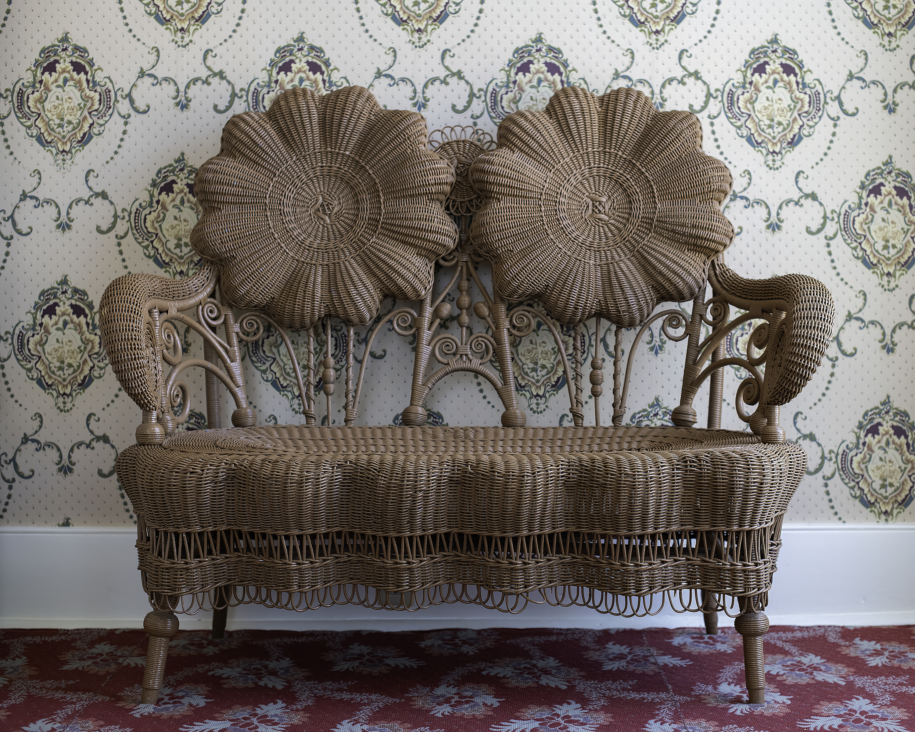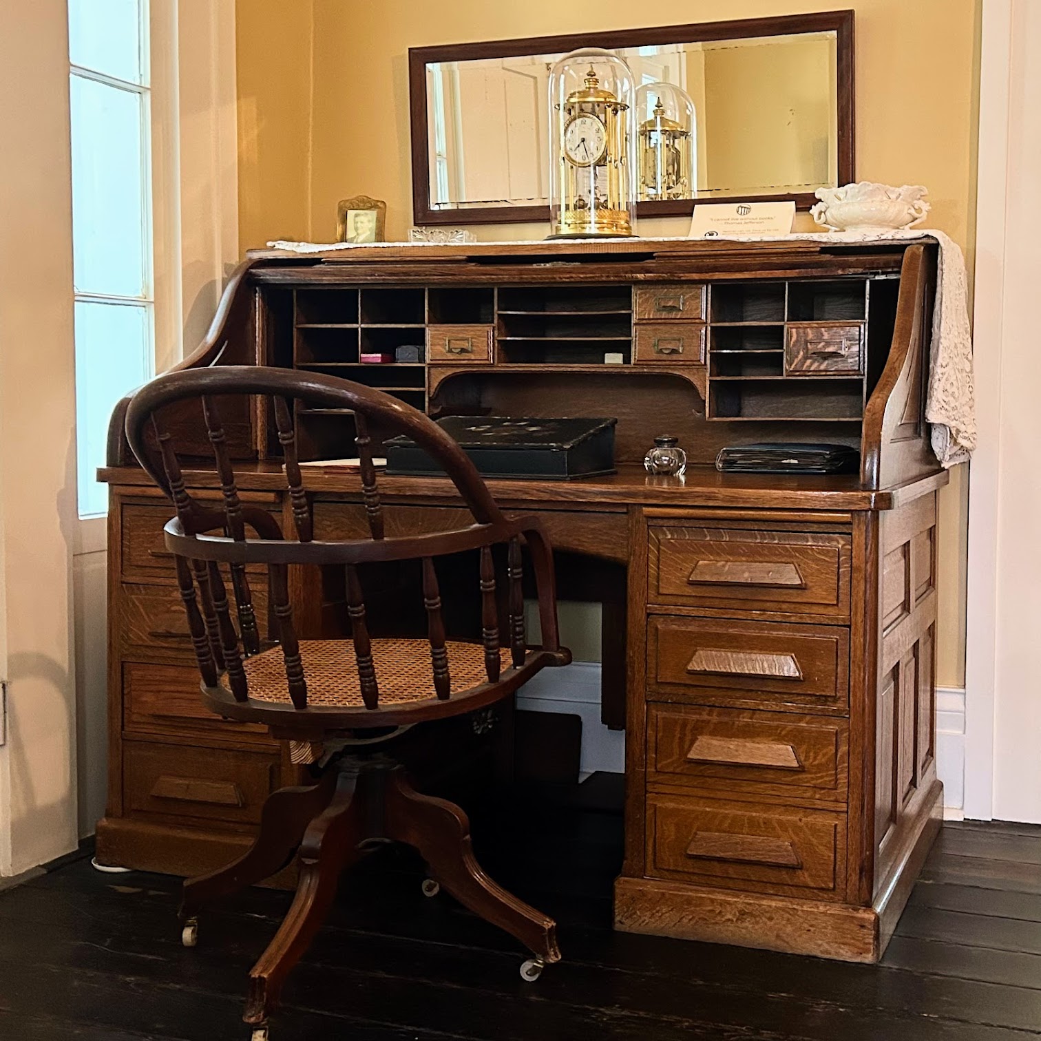 Note the simplicity of the design of the upstairs hall. While the decorative trim around the doors downstairs featured tapering arms and a slight overhanging pediment, the trim upstairs has no decorative flourishes whatsoever. You also see the original solid wood doors to the balcony and the original wide-paneled wood floors.