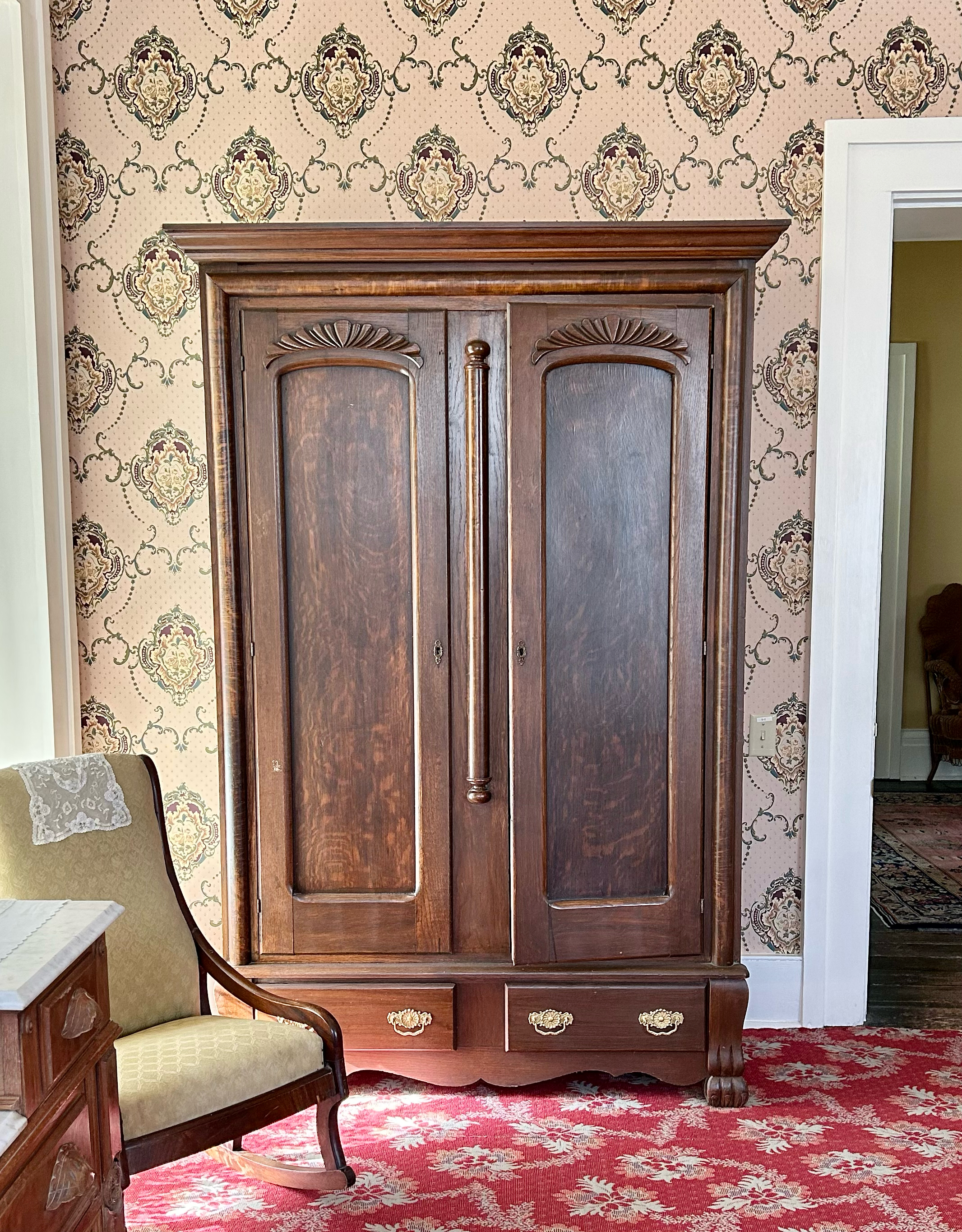 This American, late 19th century wardrobe belonged to the Cochran family. It is made of oak but feathered and faux grained to appear like mahogany. Feathering and faux graining could transform an inexpensive wood into something exquisite. In this case, the craftsman did not bother to continue the artifice on the interior of the wardrobe. The upstairs of the Neill-Cochran House originally had no closets, making wardrobes essential storage furniture.