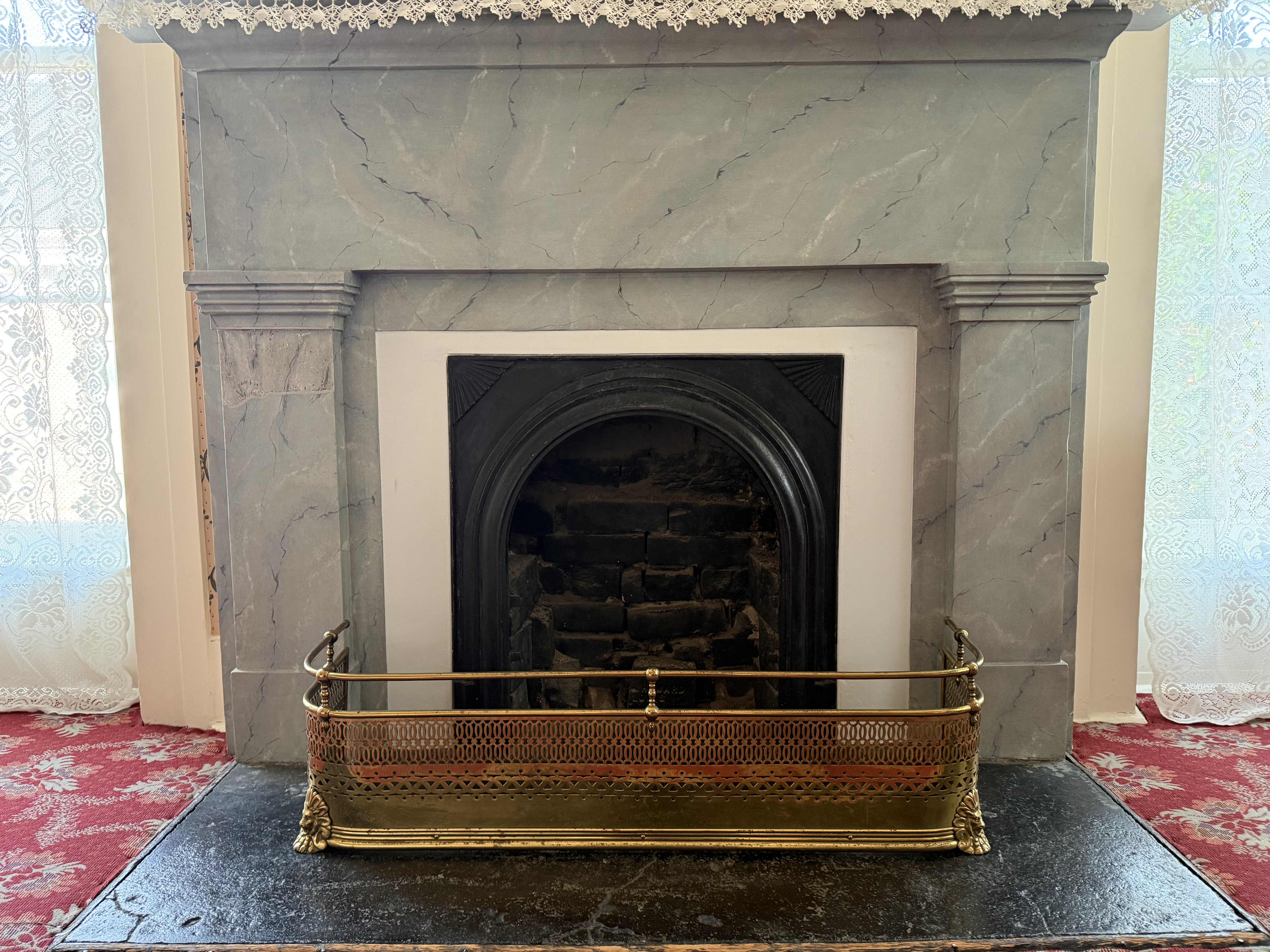 While conducting restoration work in 2010, we discovered something fascinating - the mantelpieces upstairs had been faux marbleized! A conservation expert uncovered a portion of the original painting - likely from the Neill time period. This is particularly unusual because these mantelpieces are upstairs, away from the public eye.
